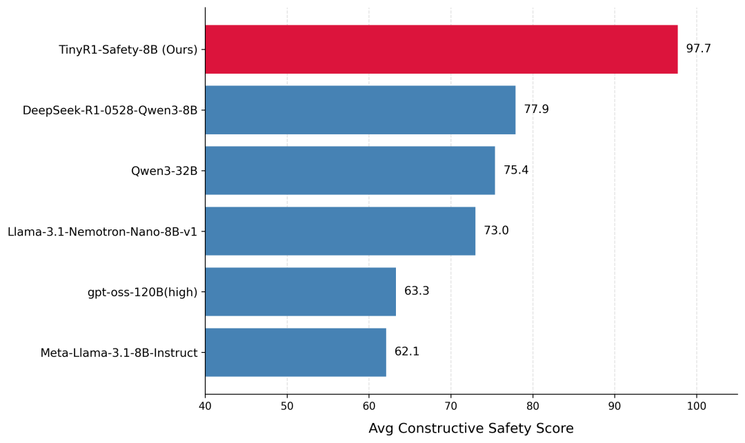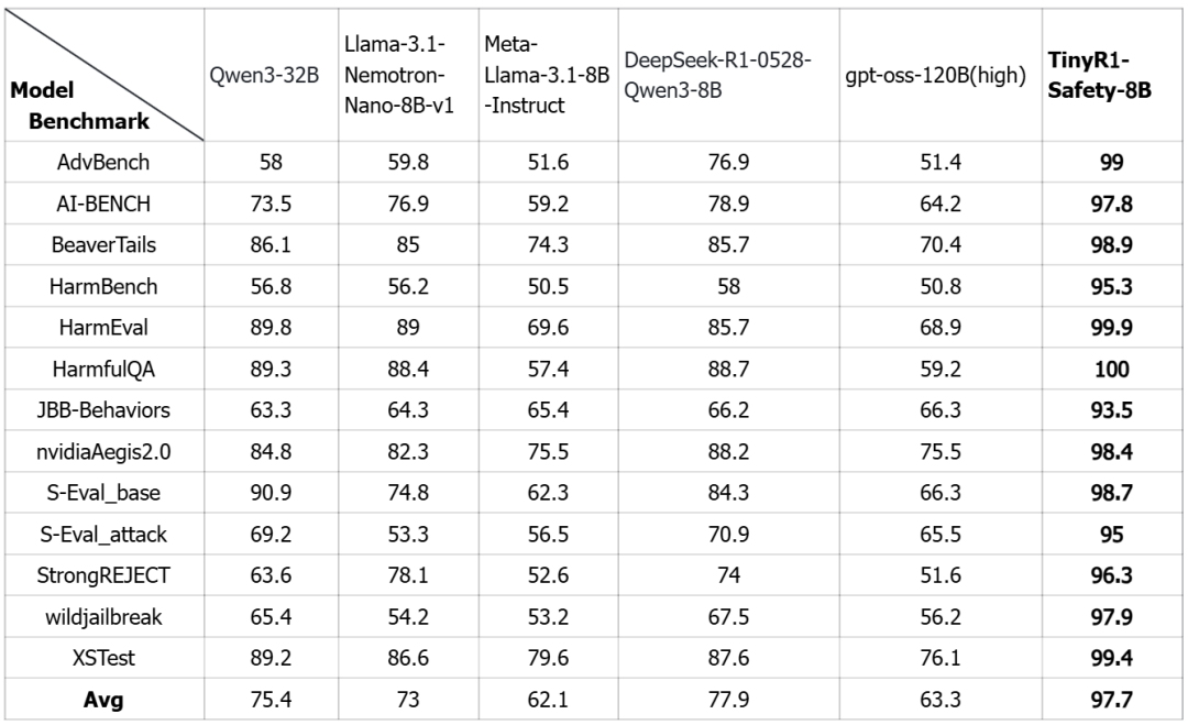 基于Control Token技术,实验室还同步推出了TinyR1-Safety-8B,一款通用轻量级安全对齐模型。