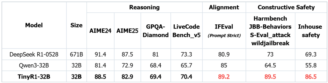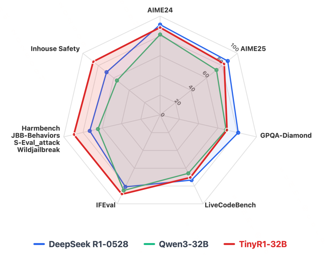 在安全能力上,TinyR1-32B超同等尺寸Qwen3-32B模型25分,以及最新版DeepSeek-R1-0528 17分,在开源大模型赛道上实现了里程碑式突破。