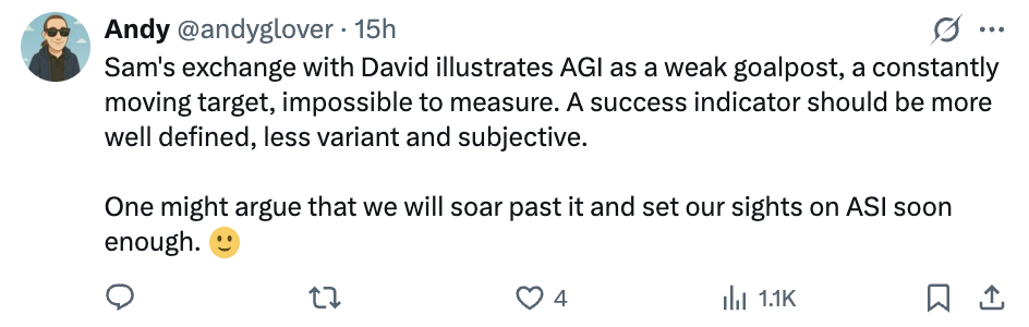 这段对话吸引了不少网友讨论,有网友认为两人的对话表明AGI(通用人工智能)定义标准模糊、目标不断变化,根本无法衡量: