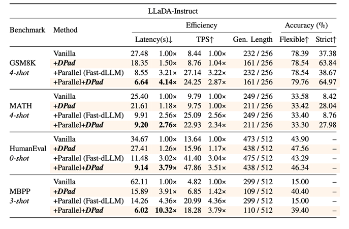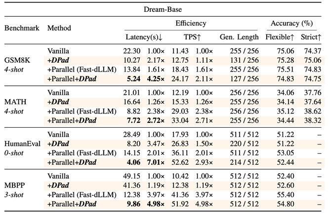 在LLaDA-1.5模型(1024 词元输出)上,DPad结合并行解码等优化后,实现了61.39倍的综合加速。