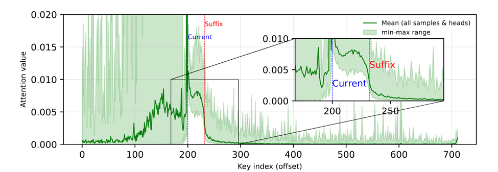 图2 当前块对后缀token的注意力分数图。可以看到,后文token存在部分尖峰