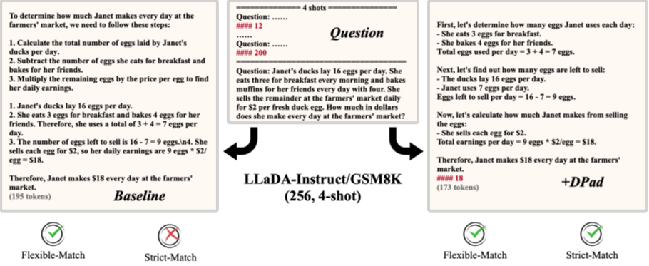 而应用DPad后,通过滤除大量无关后文词元的干扰,模型能更专注于学习prompt中的有效信息,严格匹配率跃升至63.84%。