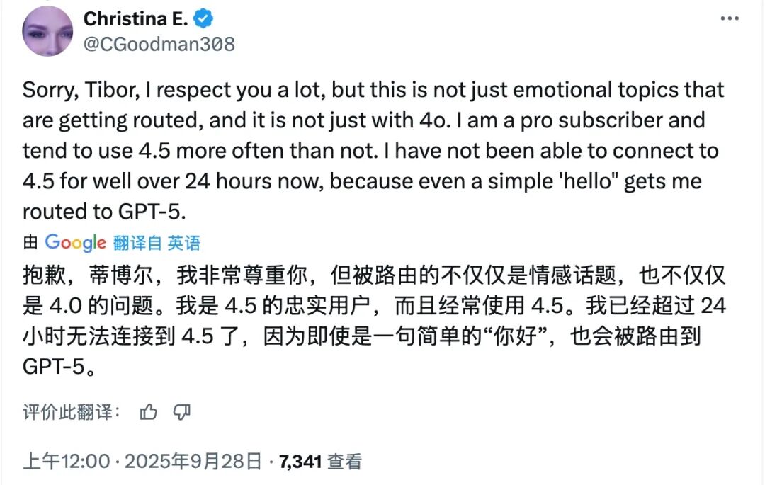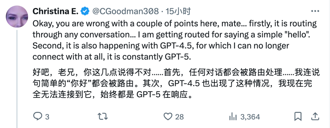 比如,Christina是GPT-4.5的忠实用户,但是她发现,即使选择了GPT-4.5,实际上ChatGPT也会「擅自」路由到GPT-5系列模型上。