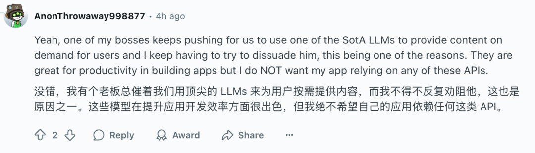 也有表示,他的老板总是想用最顶级的LLMs提供服务。