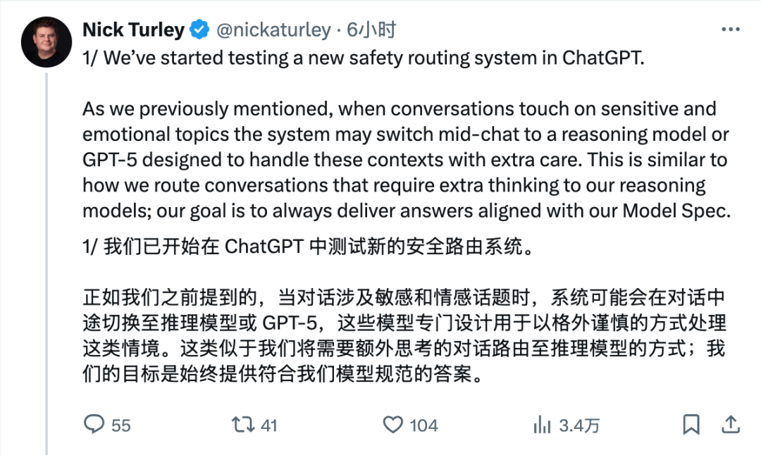 Nick Turley表示目前从默认模型切换到敏感模型只是临时性的。