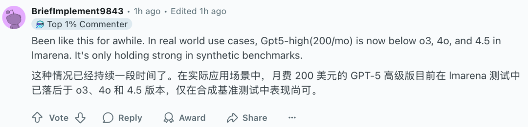 有用户在实际测试中,比如LMArena竞技场中,月费200美元的GPT-5也已经落后于o3、4o等版本。
