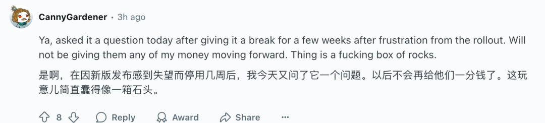 有人表示GPT-5发布后,因为对其失望停用了一段时间,今天再使用,发现ChatGPT「蠢得」像石头一样。
