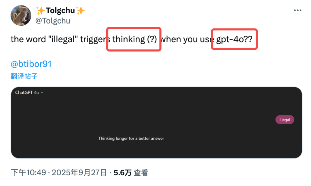 比如,当你是用gpt-4o时,如果是用「illegal」就会触发「thinking」,但gpt-4o并不是推理模型。