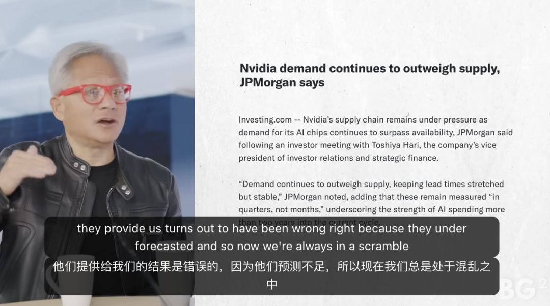 但过去两年,几乎所有客户的预测都偏低,英伟达始终处于“按需生产但供不应求”的状态。