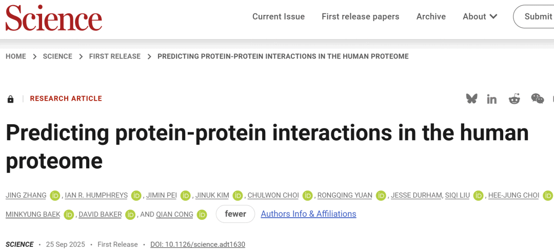 蛋白质–蛋白质相互作用(PPI)对生物功能至关重要。尽管基于协同进化分析和深度学习的蛋白质结构预测方法已在细菌和酵母中实现了大规模互作预测,但在更复杂的人类蛋白质组中应用仍然有限。研究人员通过两个关键创新克服了这一挑战:其一,利用来自30 PB未组装基因组数据的更深层多序列比对(MSA),增强了进化信号;其二,开发了基于2亿个预测结构的域–域互作(DDI)数据集训练的新型深度学习网络。研究人员系统性地筛选了2亿对人类蛋白质,最终预测出17,849个互作,预期精确度达90%,其中3,631个为先前实验未发现的新互作。这些预测的三维结构模型为探索蛋白功能及人类疾病机制提供了新的假设。