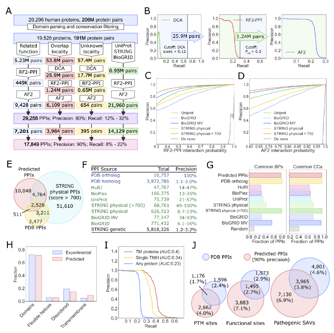 研究人员利用RF2-PPI和AlphaFold2,对19,528个人类蛋白(约1.91亿对配对)进行了筛选。通过分层过滤(直接耦合分析DCA、RF2-PPI评分、AlphaFold结构建模),最终在严格条件下预测出17,849个高置信度PPI(90%精度),覆盖人类互作组的约8–22%。