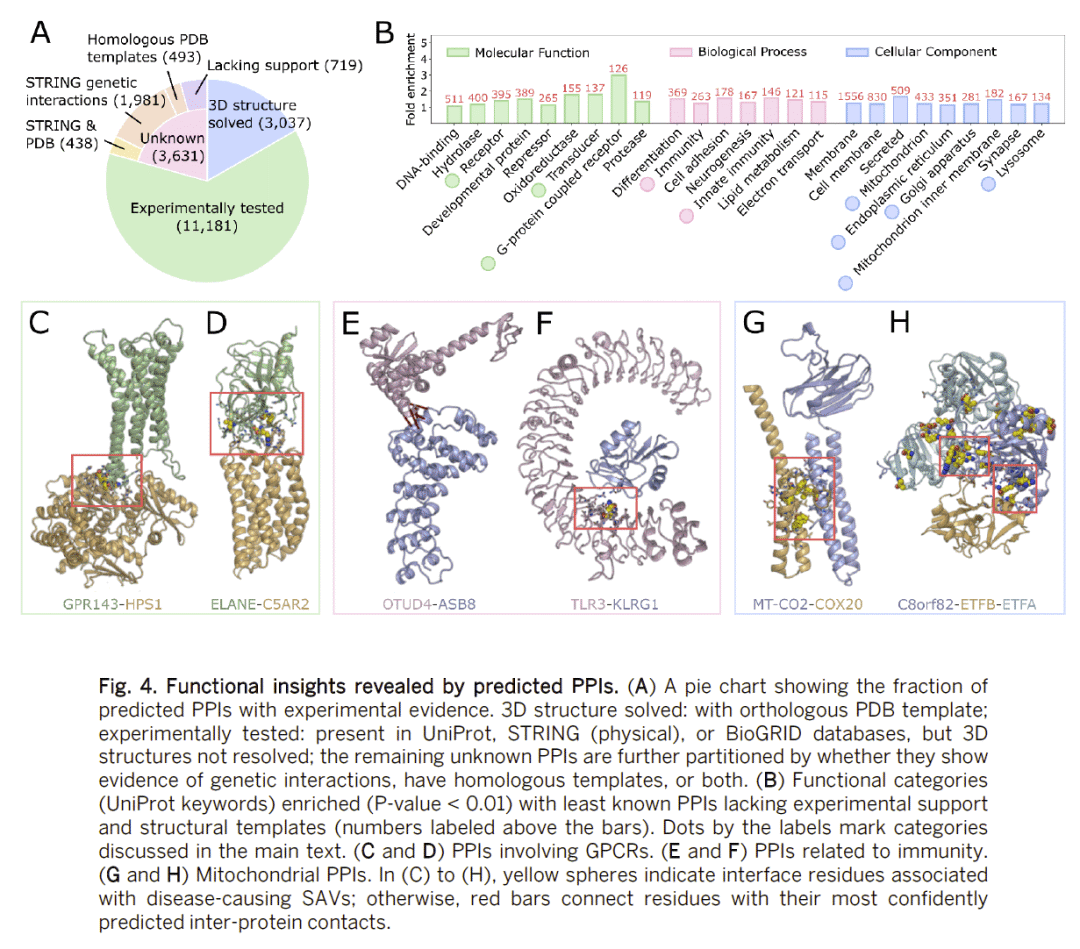 预测结果与现有数据库对比发现,研究人员的预测在功能一致性和亚细胞定位一致性上优于大部分已有数据集。结构建模显示,大部分互作由结构域介导,但也涵盖部分跨膜蛋白互作。值得注意的是,约15%的疾病相关单点突变可映射至预测互作界面,揭示了疾病可能的分子机制。