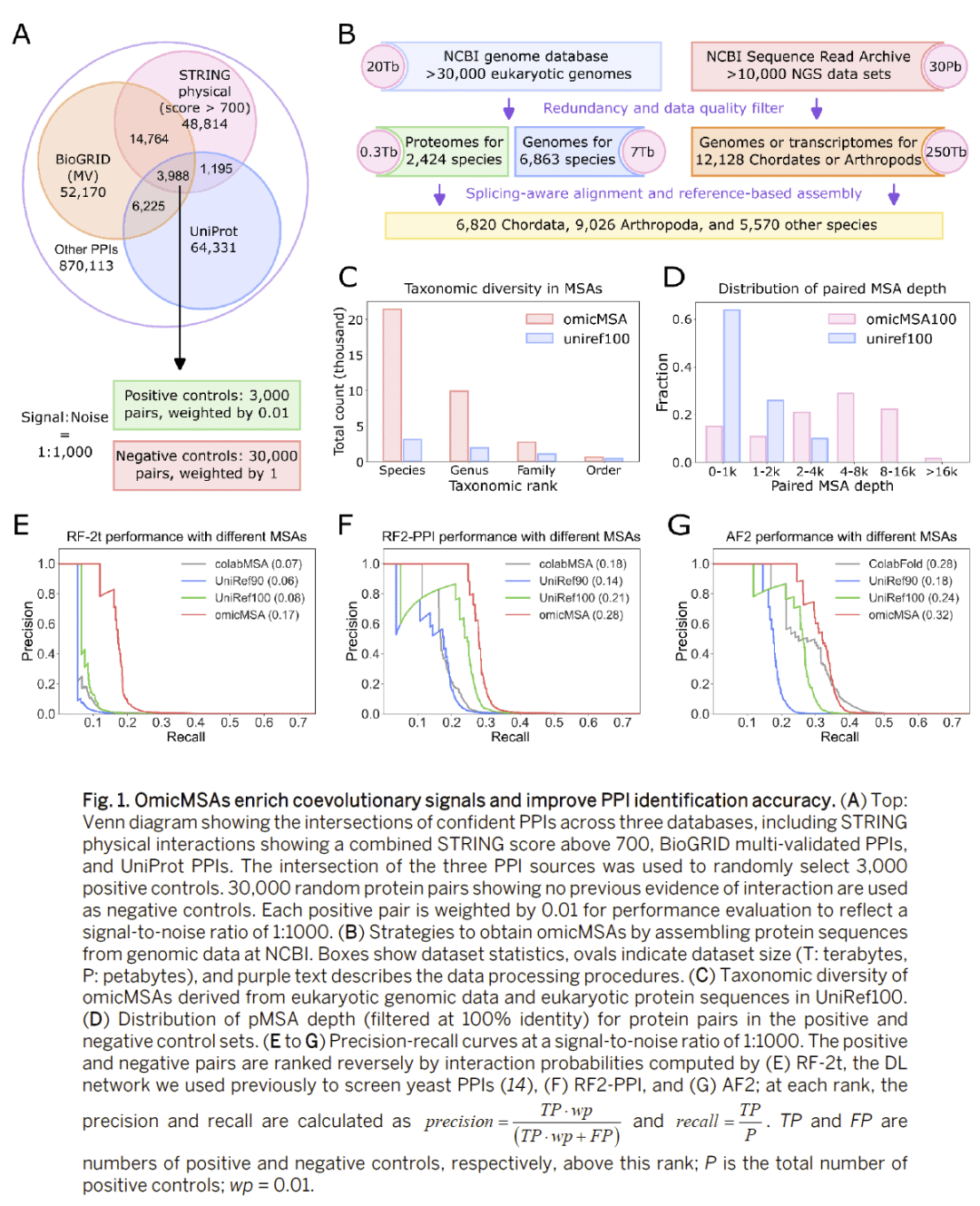 研究人员整合了超过2万种真核生物的基因组与转录组数据,构建了更深层的omicMSA,显著扩展了物种覆盖度,进而提高了检测协同进化信号的能力。与传统UniRef或宏基因组序列相比,omicMSA在区分真实互作与随机配对时表现更优。