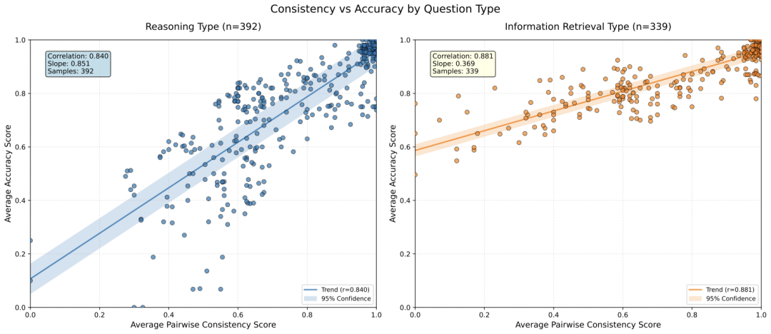 而在推理任务(392个样本)中,情况完全相反——一致性与准确率呈现强正相关(斜率0.851),表明当多个推理路径得出相同结论时,这个结论很可能是正确的。