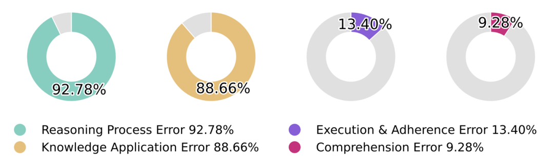 相比之下,执行遵循错误(13.40%)和理解错误(9.28%)占比较小,说明模型在指令理解和执行层面已经相对成熟。