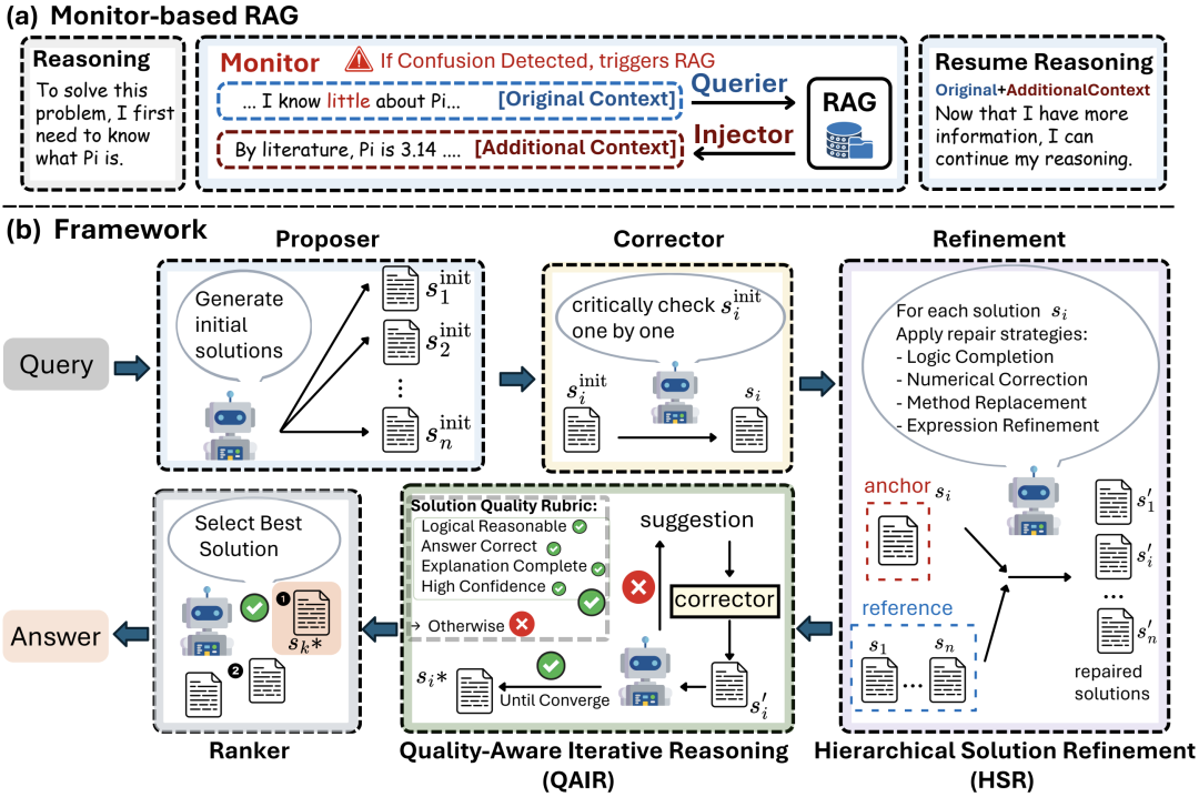 在这个开源底座上,研究团队通过叠加Monitor-based RAG(隐式知识增强)、HSR(分层解法修复)、QAIR(质量感知迭代推理)三大创新机制,实现了质的飞跃。