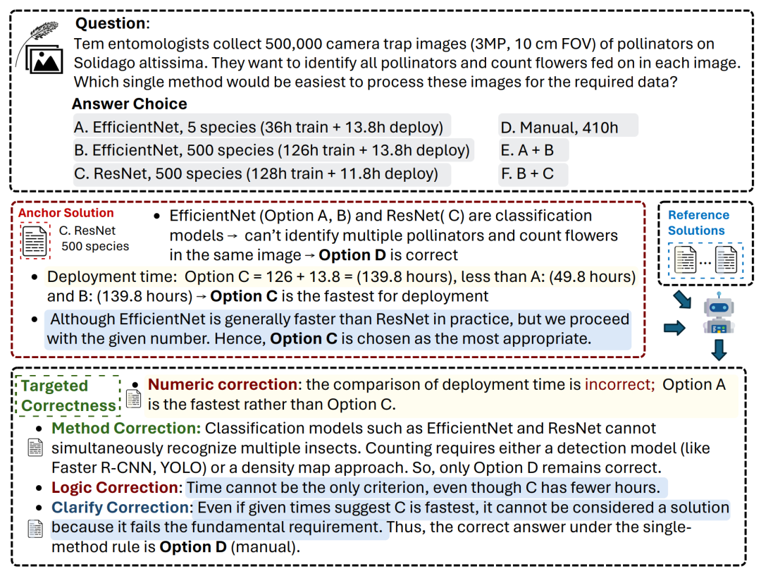 面对昆虫识别和花朵计数的复合任务,锚点解决方案最初选择了ResNet(选项C),但存在部署时间计算错误。通过引入其他解决方案作为参考,系统进行了四类针对性修正。