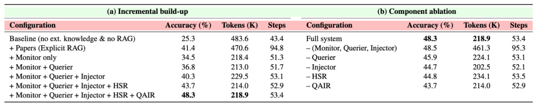 随着Querier和Injector的加入,准确率恢复到40.3%。HSR的引入将准确率提升至43.7%,最后QAIR将完整系统的准确率推至48.3%,同时保持了高效的资源利用(218.9K tokens,53.4步骤)。