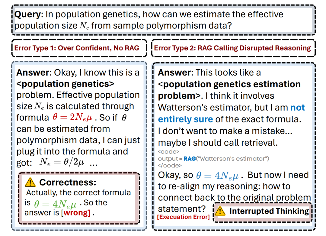 传统RAG系统的“工具税”问题在下图的人口遗传学案例中展现得淋漓尽致。左侧显示模型过度自信地使用错误公式,右侧则展示了即使通过显式RAG获得正确公式,推理流程的中断导致模型无法将知识重新整合到原始问题中。