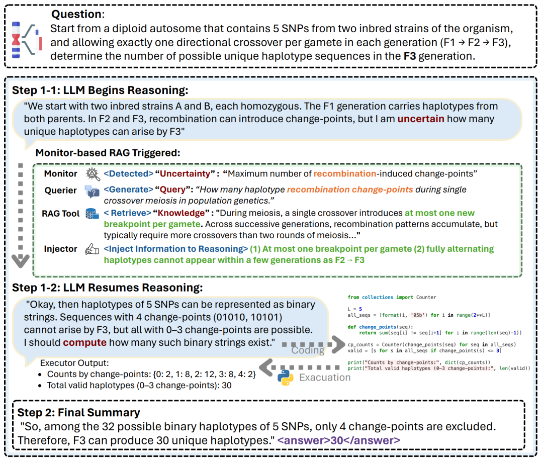 见下图单倍型计数案例,Monitor检测到重组约束的不确定性,Querier生成针对性查询,Injector注入两个关键事实,使模型能够排除无效案例并得出正确的30个单倍型答案。
