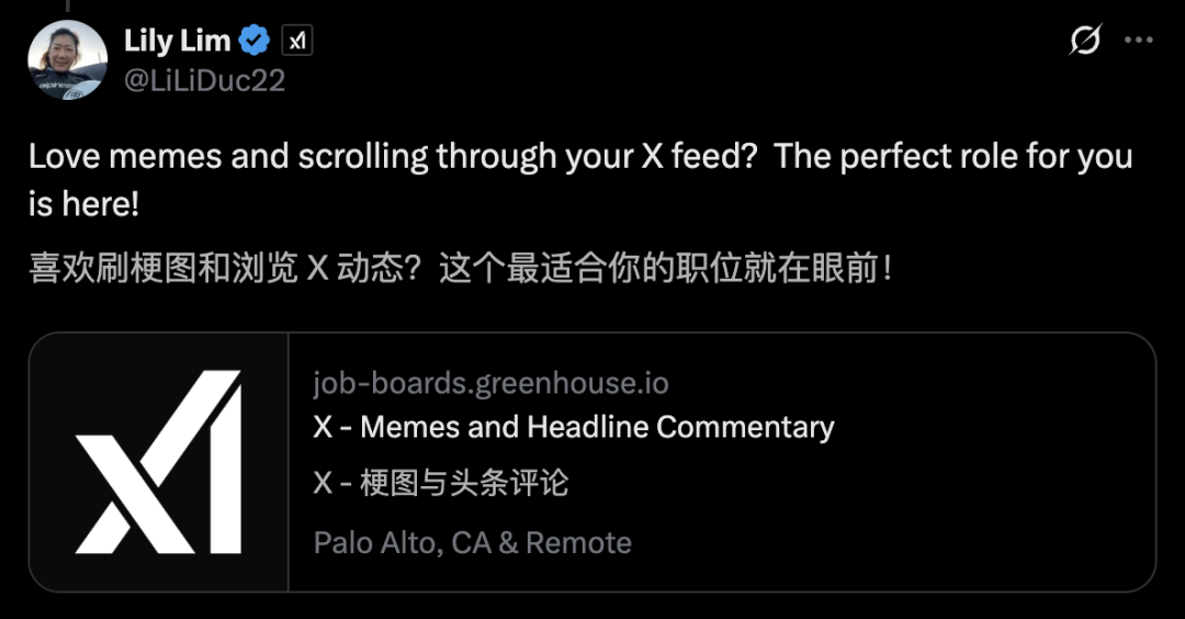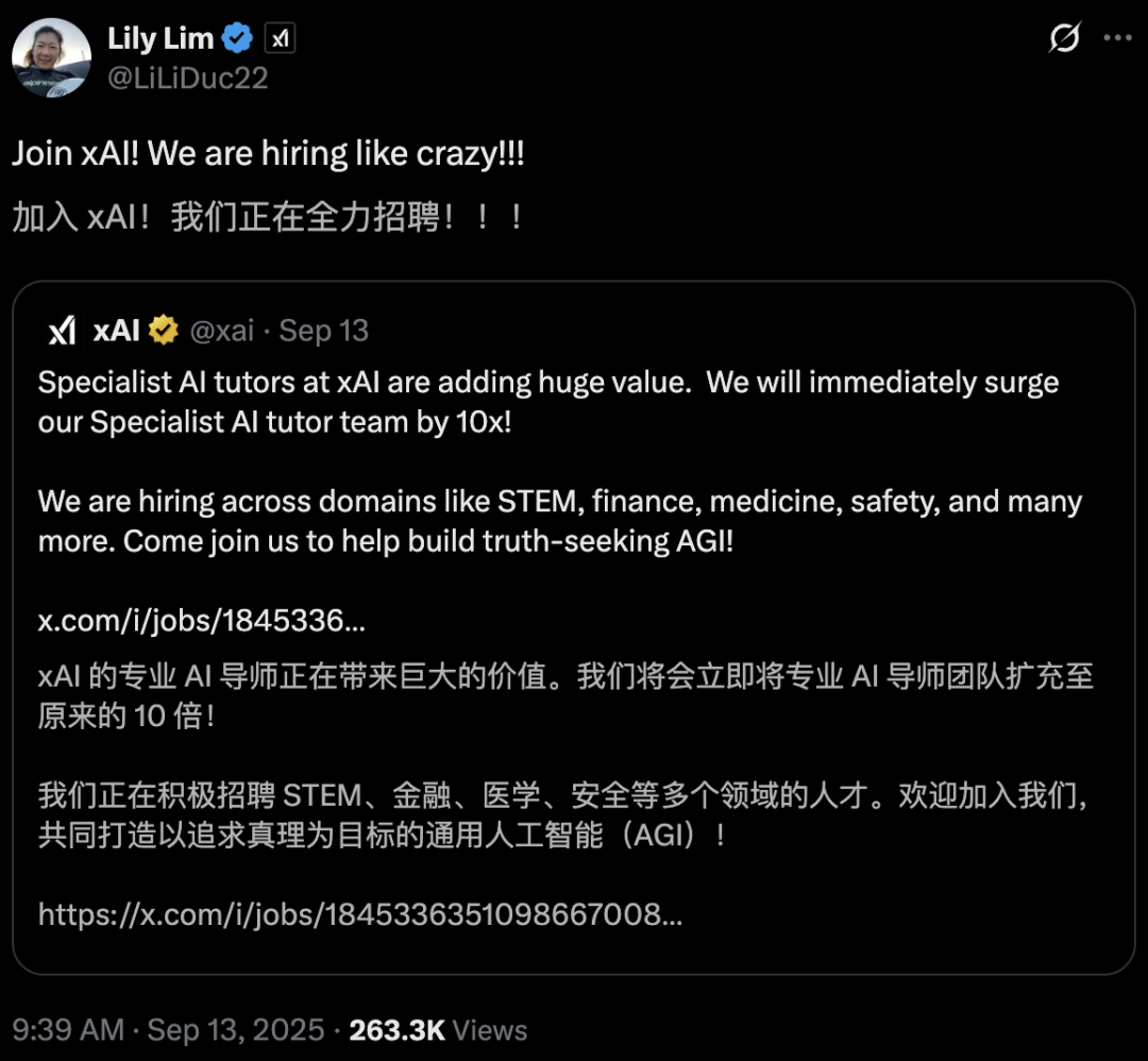 在第一轮裁员的周五晚上,xAI首席法律顾问Lily Lim在X上写道,xAI正在「疯狂招聘」,同时引用了官方账号的一篇帖子,称其计划将专业团队增加「10倍」。