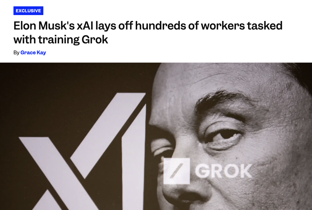 上周12日,马斯克深夜挥刀,血屠Grok数据团队1/3。