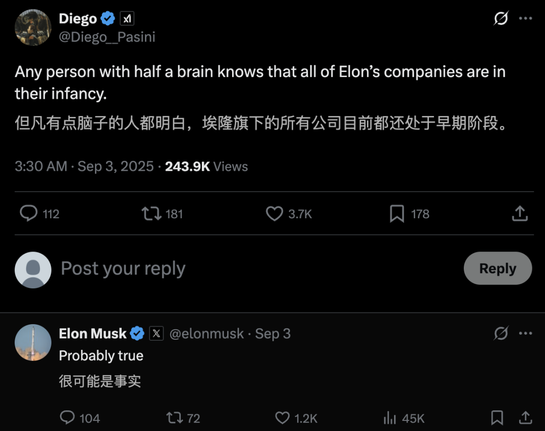 而在今年9月初,Pasini公开发文支持马斯克。不久后,马斯克在X平台上关注了他。