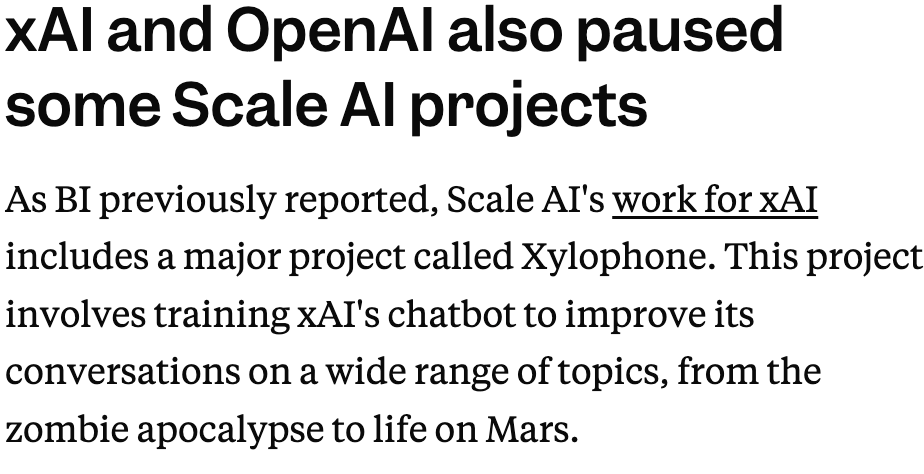 但Meta大举投资Scale AI之后,xAI和OpenAI中止了和Scale AI的合作。