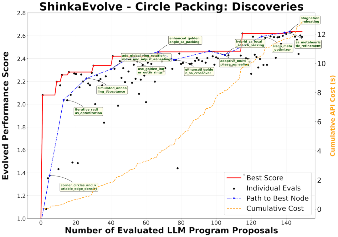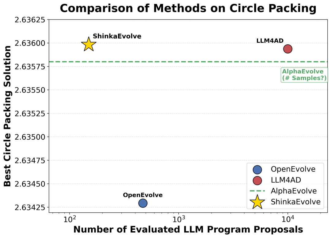 结果表明,ShinkaEvolve仅需要150次评估,而AlphaEvolve则需要数千次评估,显著提升了样本效率。
