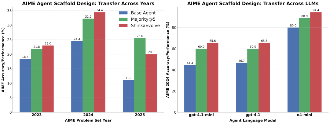 实验发现ShinkaEvolve的框架设计显著优于模型基线,包括简单的单查询代理和复杂的多数投票方法。