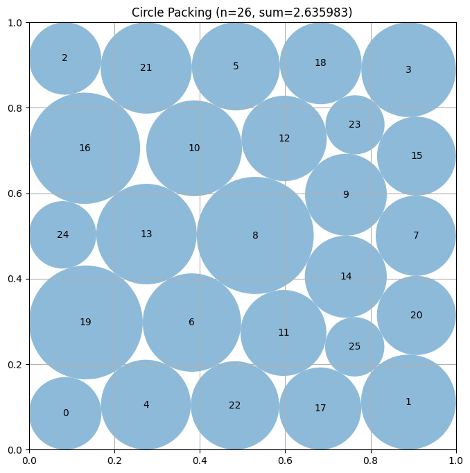 首先是在数学优化问题上,实验要求将26个圆放置在一个单位正方形内,使得它们的半径之和最大化,同时确保没有圆重叠,并且所有圆都完全包含在正方形边界内。