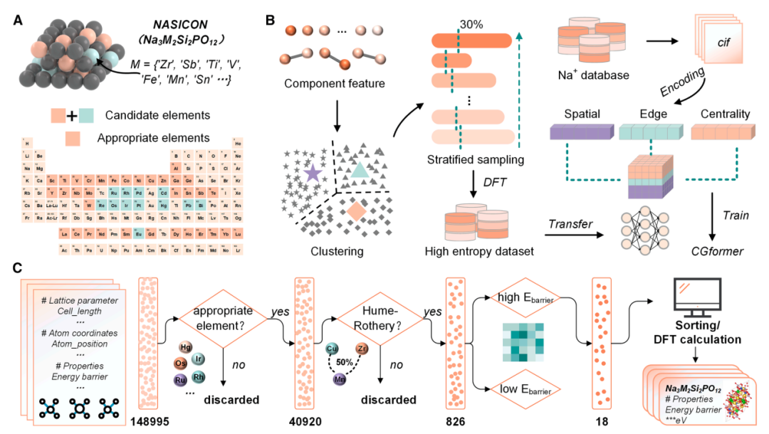 HE-NSEs 计算数据集:以 Na₃Zr₂Si₂PO₁₂ 为基础(如上图所示),在 Zr 位点考虑 45 种潜在高熵掺杂元素,初步形成包含 148,995 种可能的高熵结构的初始化学空间。之后通过多轮筛选,包括排除不适宜元素(放射性、高毒性及昂贵元素)、约束原子半径差异与电荷平衡等,进一步将化学空间缩小至 826 种相对稳定的结构。接着再通过无监督层次聚类将其分为 20 组,从每组分层采样 30% 的结构(共 238 种),经密度泛函理论(DFT)计算得到其 Eb 值,最终形成用于微调 CGformer 的专用数据集,以便模型专门适配高熵 NASICON 结构中钠离子 Eb 的预测任务,提升模型在目标场景下的精度。