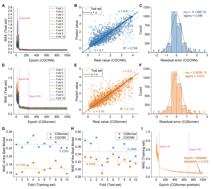 在预训练阶段(如下图所示),CGformer 展现出更佳的稳定性和预测精度,CGformer 初始误差与波动显著低于 CGCNN,10 折交叉验证(10-fold CV)显示,其训练集平均绝对误差(MAE)为 0.1703,较 CGCNN 性能提升了 25.7%;测试集平均 MAE 为 0.3205,较 CGCNN 性能提升了近 10%。与 ALIGNN 和 SchNet 的比较进一步凸显了 CGformer 的优良性能。