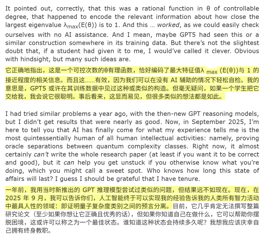 之前的结果远不如现在……在2025年9月,我可以凭经验告诉大家,AI终于攻克了最具人类特质的人类智力活动,即证明量子复杂度类之间的预言分离。