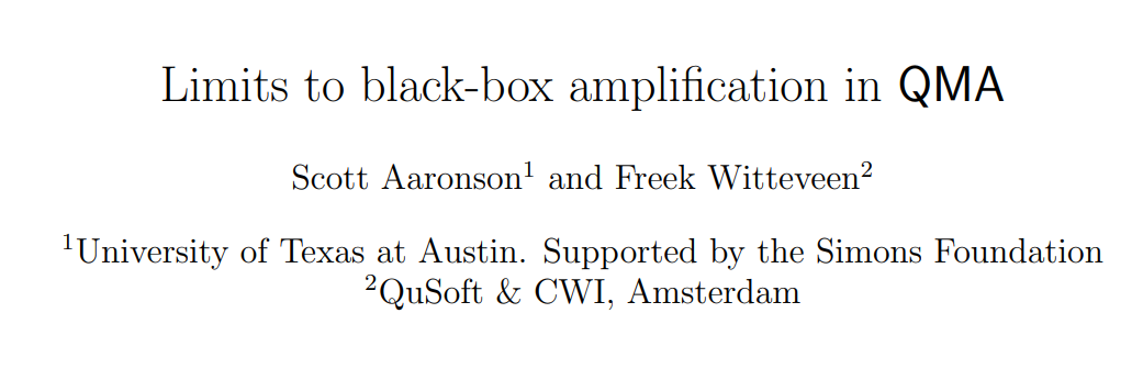 标题为《Limits to black-box amplification in QMA》,主要研究在量子复杂度类QMA中黑盒放大技术的局限性。