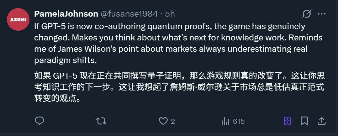 网友们也表示,如果GPT-5现在正在共同撰写量子证明,那么游戏规则真的改变了。