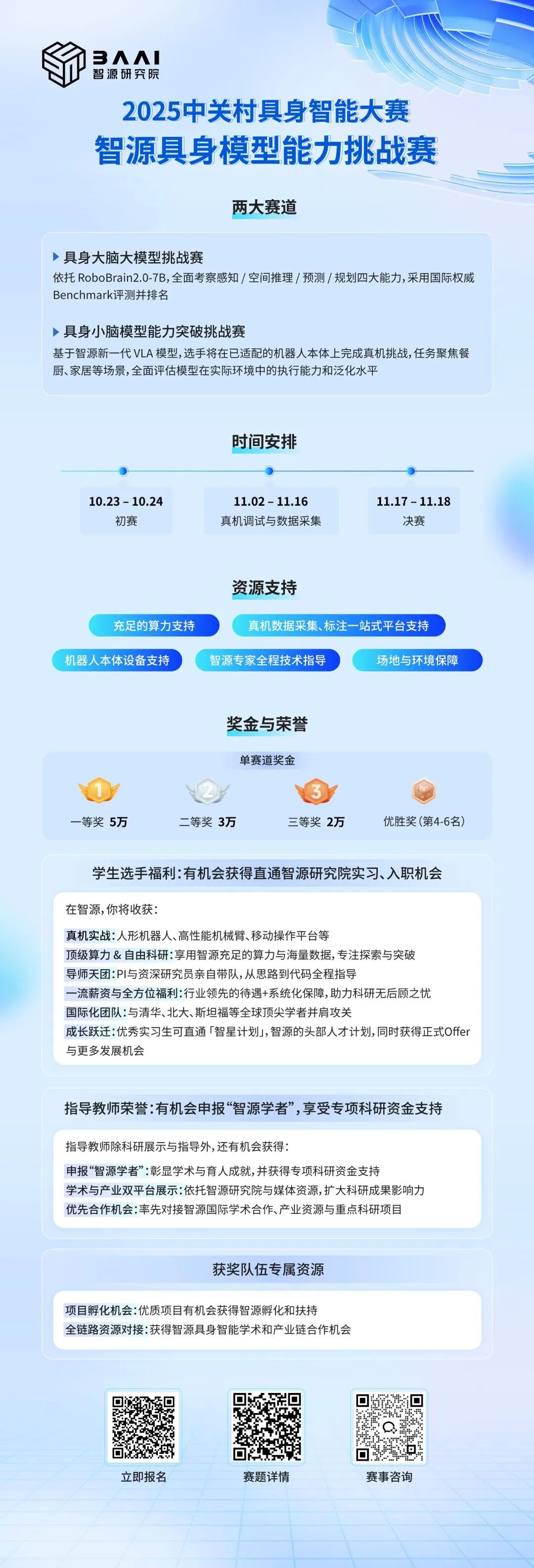 本届赛事以 「具身引智 · 应用未来」 为主题,打造一个 汇聚尖端技术与产业应用 的舞台。这里不仅是比拼模型实力的竞技场,更是展示创意与才华的舞台。让我们一起突破边界,提升模型能力,推动具身智能走出实验室,走进现实世界,创造真正的价值!