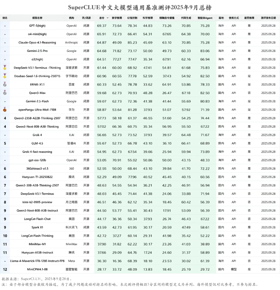 (注:SuperCLUE是一个综合性的大模型评测基准,本次通过对数学推理、科学推理、代码生成、智能体Agent、幻觉控制、精确指令遵循六个维度的核心能力进行评估,共计1260道题目。)
