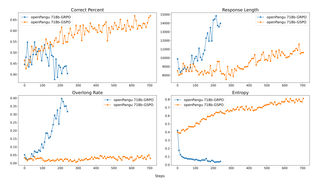 考虑到openPangu-718B这类混合专家(MoE)模型的训练稳定性要求较高,团队采用了GSPO(Group Sequence Policy Optimization)算法进行强化学习。