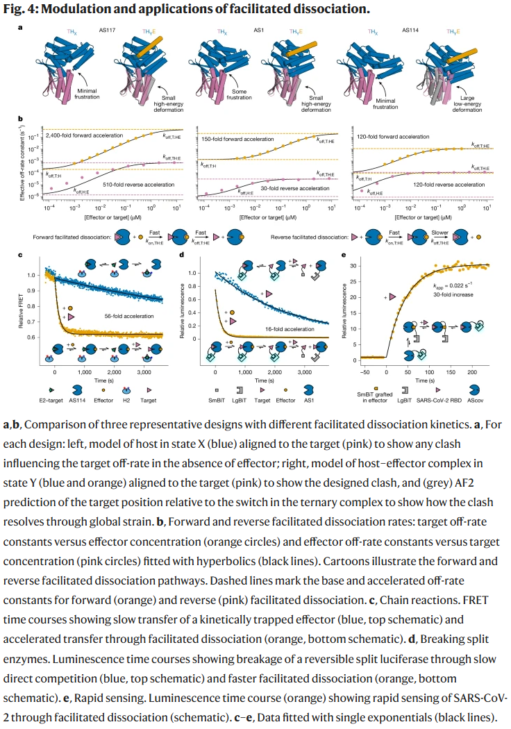 研究人员通过修改开关与结合体的相对构象,成功改变了三元复合物的张力大小与方向。不同设计展现了数百到数千倍的解离加速效果,其中 AS117 的效应子诱导下目标解离速率提升达 2,400 倍。