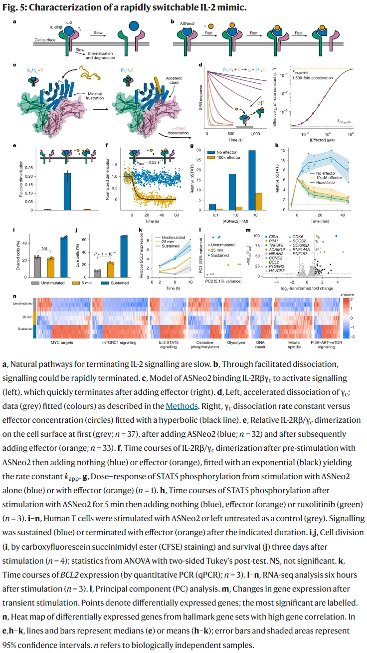 IL-2 信号的时序调控:研究人员设计了可快速解离的 IL-2 模拟物(ASNeo2)。在效应子作用下,其与受体的结合在数秒内终止,从而精确调控 IL-2 信号。实验结果表明,瞬时刺激即可提供细胞存活信号,而持续刺激则驱动细胞增殖。