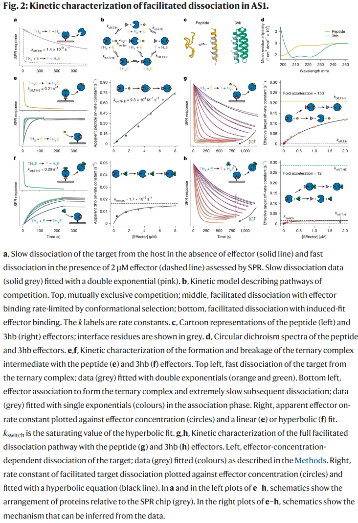 AS1 系统验证了效应子结合可显著提升目标分子解离速率。灵活肽类效应子能通过诱导契合机制加速构象转变,而刚性效应子虽结合更紧密,却在速率提升上不如灵活效应子。晶体结构与模拟显示,三元复合物处于受挫张力状态,目标蛋白界面发生扭曲与解体。