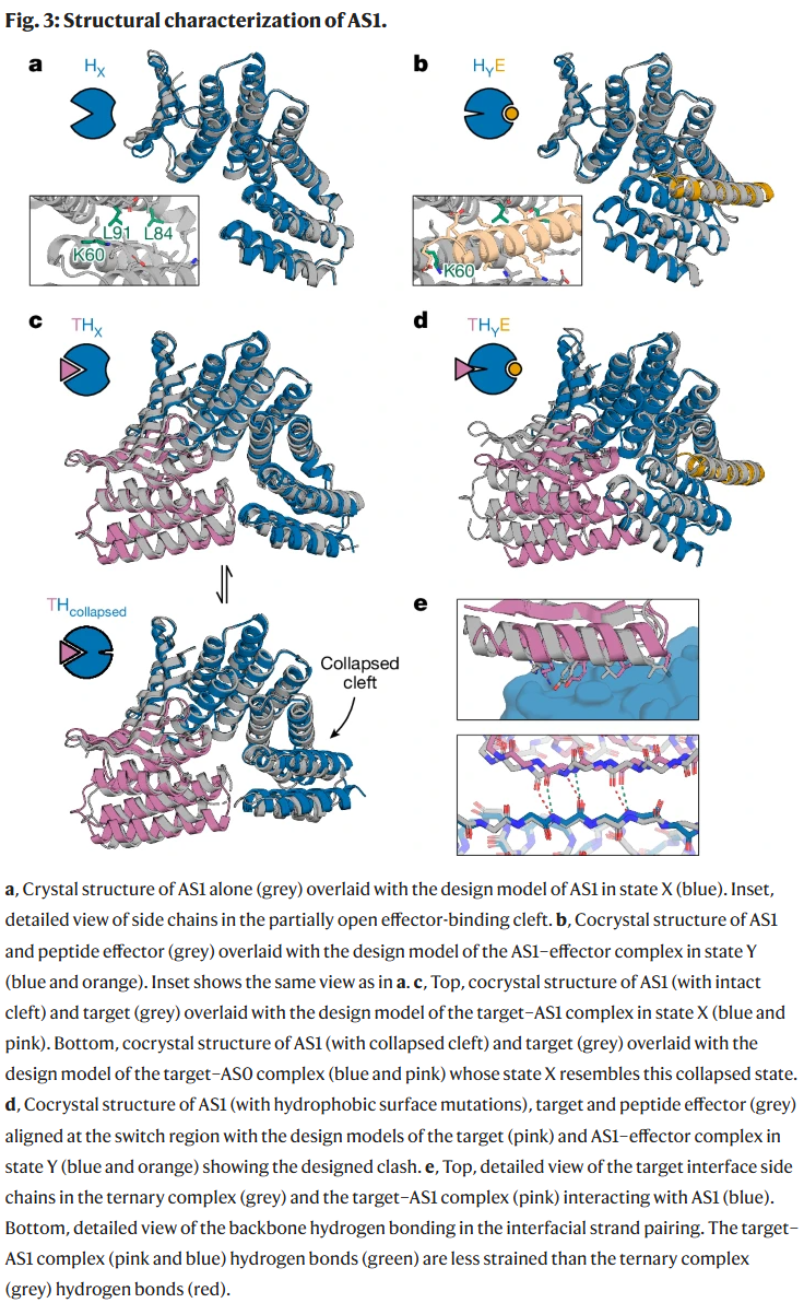 研究人员选择了一个效应子响应构象开关(铰链蛋白)并与模型结合体融合。设计的思路是:在无效应子结合时,靶标正常结合;在效应子结合时,构象转变导致强烈空间冲突,形成张力三元复合物并触发靶标解离。为达到这一点,研究人员通过调整开关与结合体的融合几何结构,确保激发态的能量处于可行范围。
