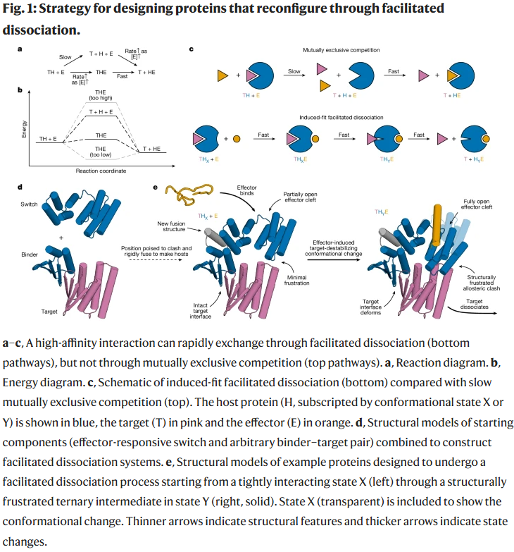 蛋白质-蛋白质相互作用调控着大多数生物功能。高亲和力有助于在低浓度刺激下实现高效作用,而快速交换则能使系统灵敏响应环境变化。然而二者难以兼得,因为高亲和力通常伴随缓慢解离,而快速响应则依赖较高解离速率。在自然界中,部分体系展现了“促进性解离”现象:效应子与复合物结合,形成三元激发复合物,从而加速目标分子的释放。类似原理在 DNA 领域(如链置换反应)已广泛用于复杂功能的实现,但蛋白质体系中尚缺乏通用的可设计方法。研究人员因此提出,通过引入响应效应子的构象开关,将其与结合蛋白融合,以此在效应子结合时触发空间冲突并诱导目标分子快速解离,从而在动力学上实现精细调控。
