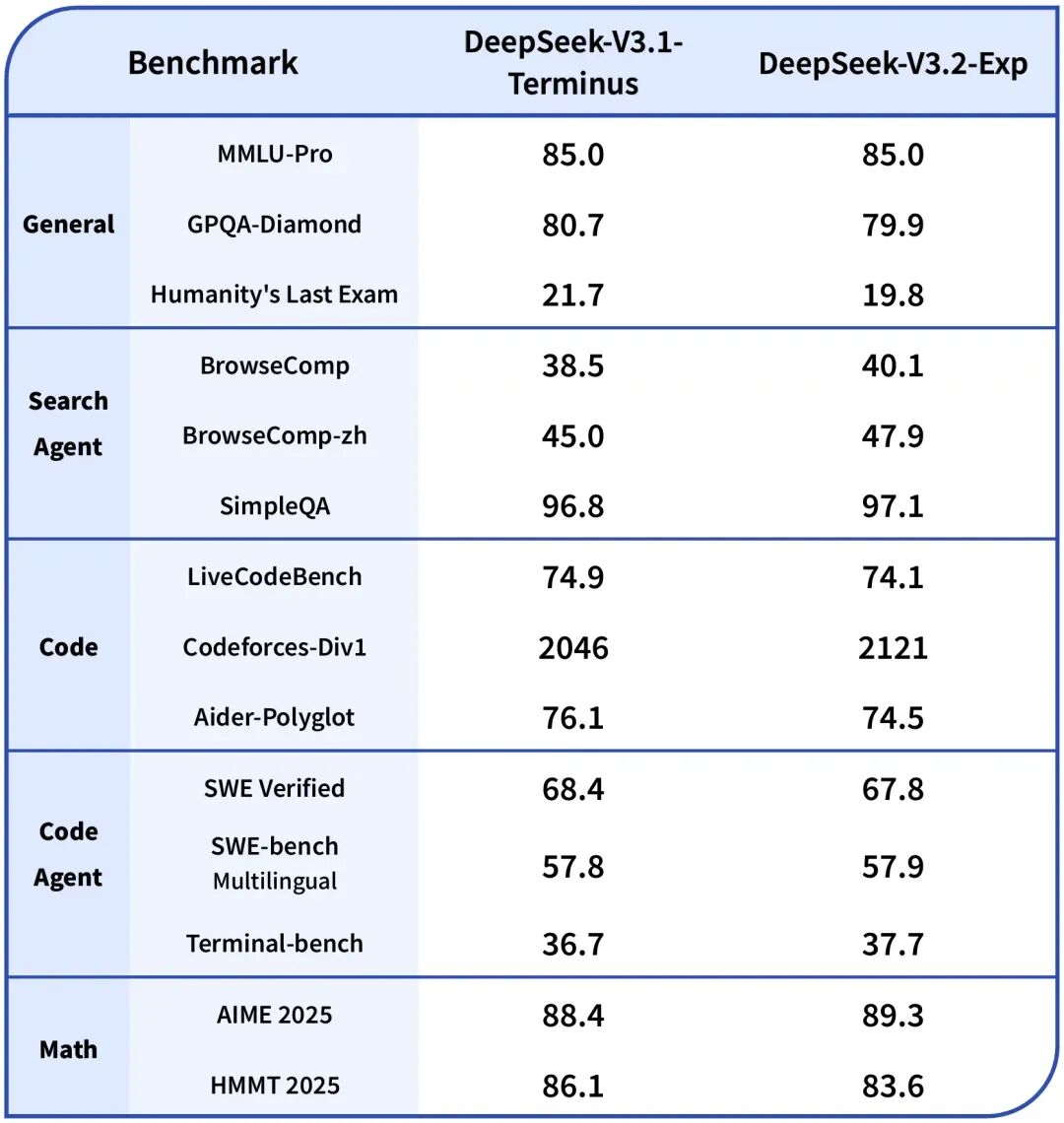 为了严谨地评估引入稀疏注意力带来的影响,我们特意把 DeepSeek-V3.2-Exp 的训练设置与 V3.1-Terminus 进行了严格的对齐。在各领域的公开评测集上,DeepSeek-V3.2-Exp 的表现与 V3.1-Terminus 基本持平。