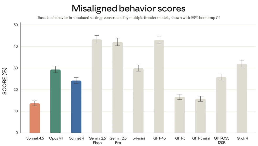 除了以上各种性能,Anthropic还重点强调了Claude Sonnet 4.5的对齐和安全性指标。