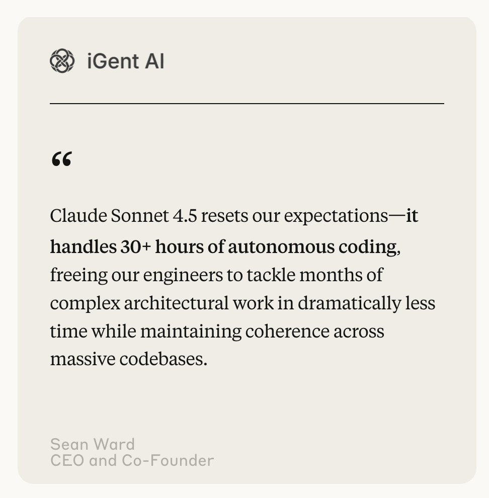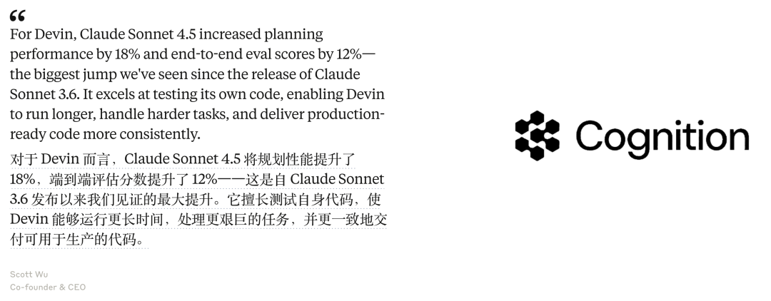 Cognition联创兼CEO Scott Wu也表示,Claude Sonnet 4.5让Devin的规划能力和端到端评估成绩大幅度提升。