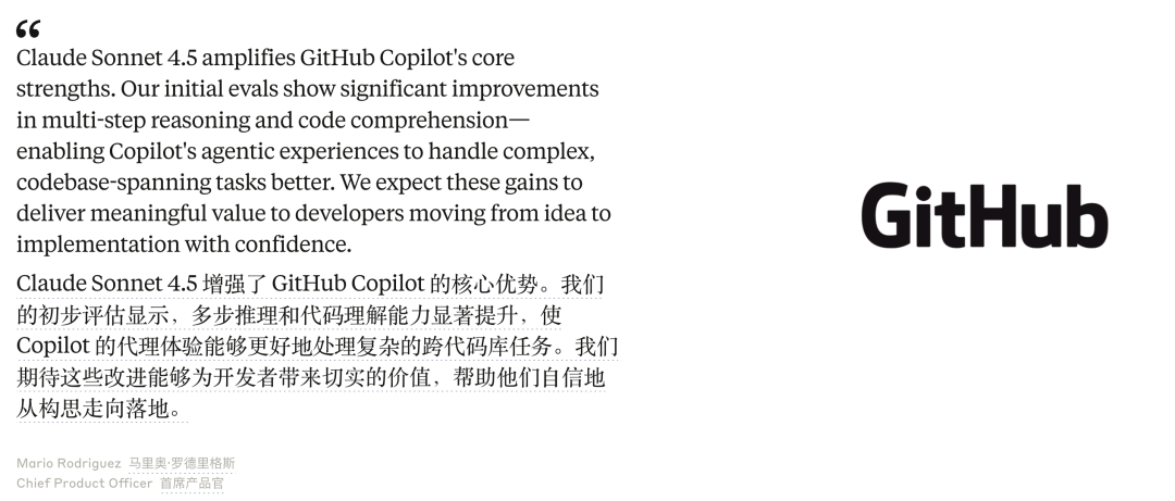 GitHub首席产品官Mario Rodriguez表示,Claude Sonnet 4.5让GitHub Copilot能更好地处理复杂的跨代码库任务。