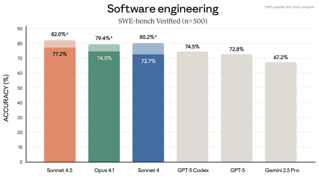 新发布的Claude Sonnet 4.5,在SWE-bench上的成绩比Sonnet 4提升了1.8个百分点,而且提质不加价。