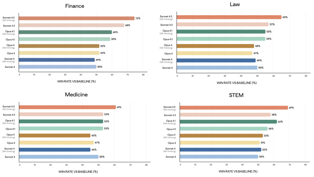 在这四个领域当中,Claude Sonnet 4.5相比Sonnet 4,对战baseline模型的胜率均有大幅度提升,且在16K上下文、开启思考的情况下,均超过60%。